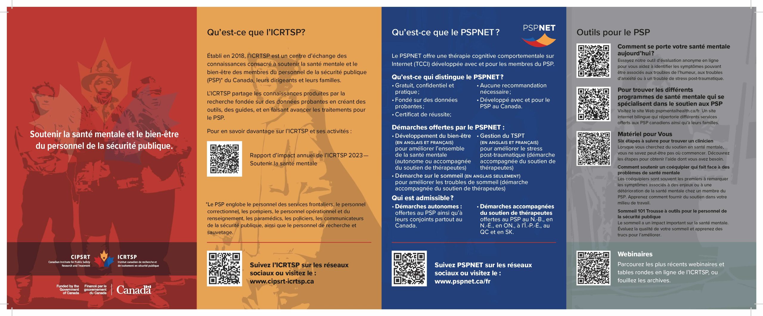 [French] Ce dépliant de type accordéon offre un aperçu exhaustif des services que l’ICRTSP et le PSPNET offrent aux membres du personnel de la sécurité publique, leurs familles et leurs dirigeants. Il contient des ressources essentielles, comme des outils de dépistage, des guides pour cliniciens, et des boîtes d’outils pour le bien-être. Le dépliant met aussi en évidence les démarches avec l’accompagnement d’un-e psychothérapeute et autonomes, y compris celles centrées sur le bien-être, le TSPT et le sommeil. De petite taille et informatif, ce dépliant est idéal à partager lors de conférences, de séances de formation et dans les milieux de travail du PSP, partout au Canada.