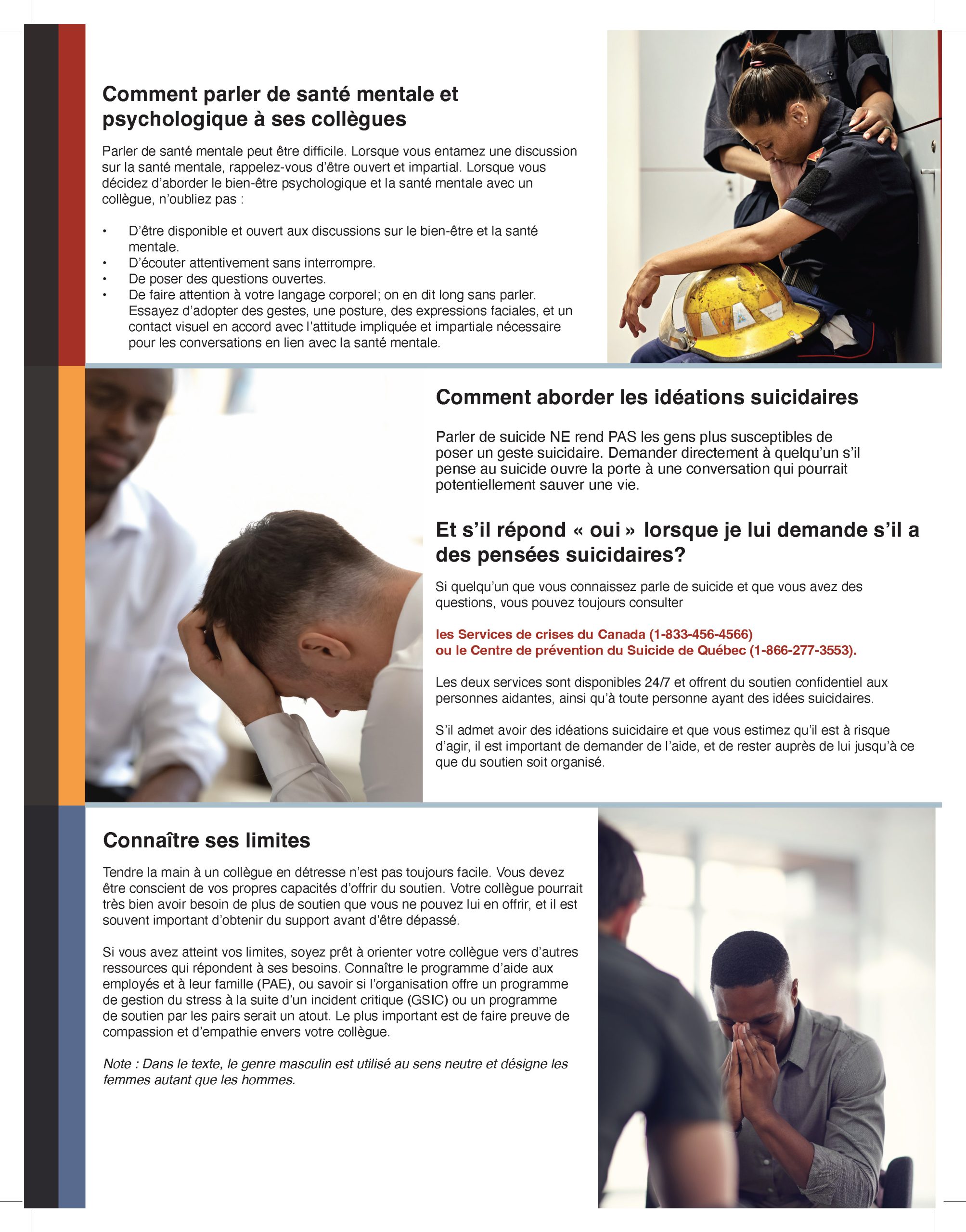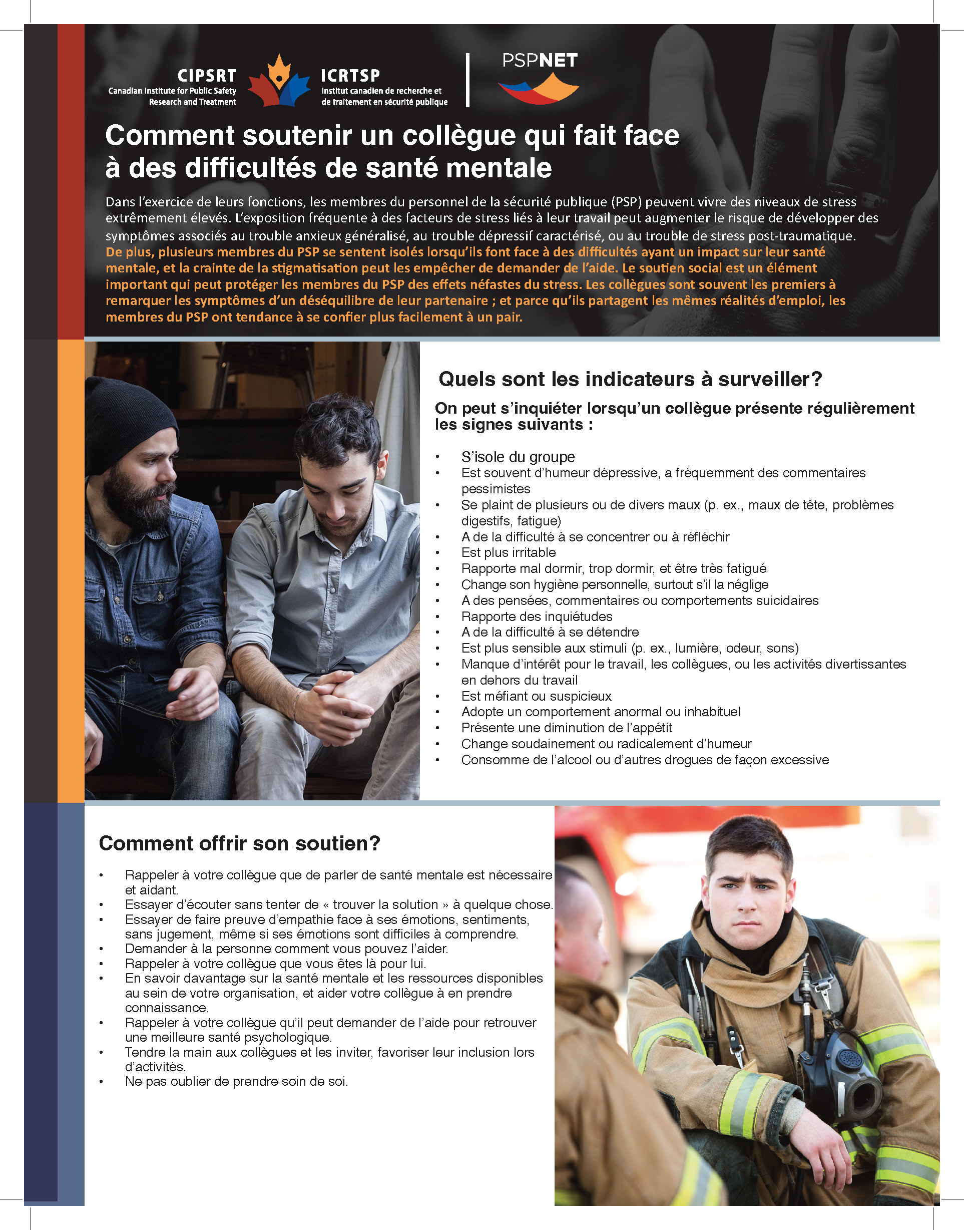 [French] Ce guide pratique permet aux membres du personnel de la sécurité publique de reconnaître les signes de problèmes de santé mentale et présente des stratégies efficaces pour offrir du soutien par les pairs empathique. Il donne également des conseils pour engager la conversation, la façon de réagir à des pensées suicidaires, et quand demander de l’aide supplémentaire. Conçu pour sensibiliser les pairs, ce document encourage une culture de soutien au sein des organiations du PSP.