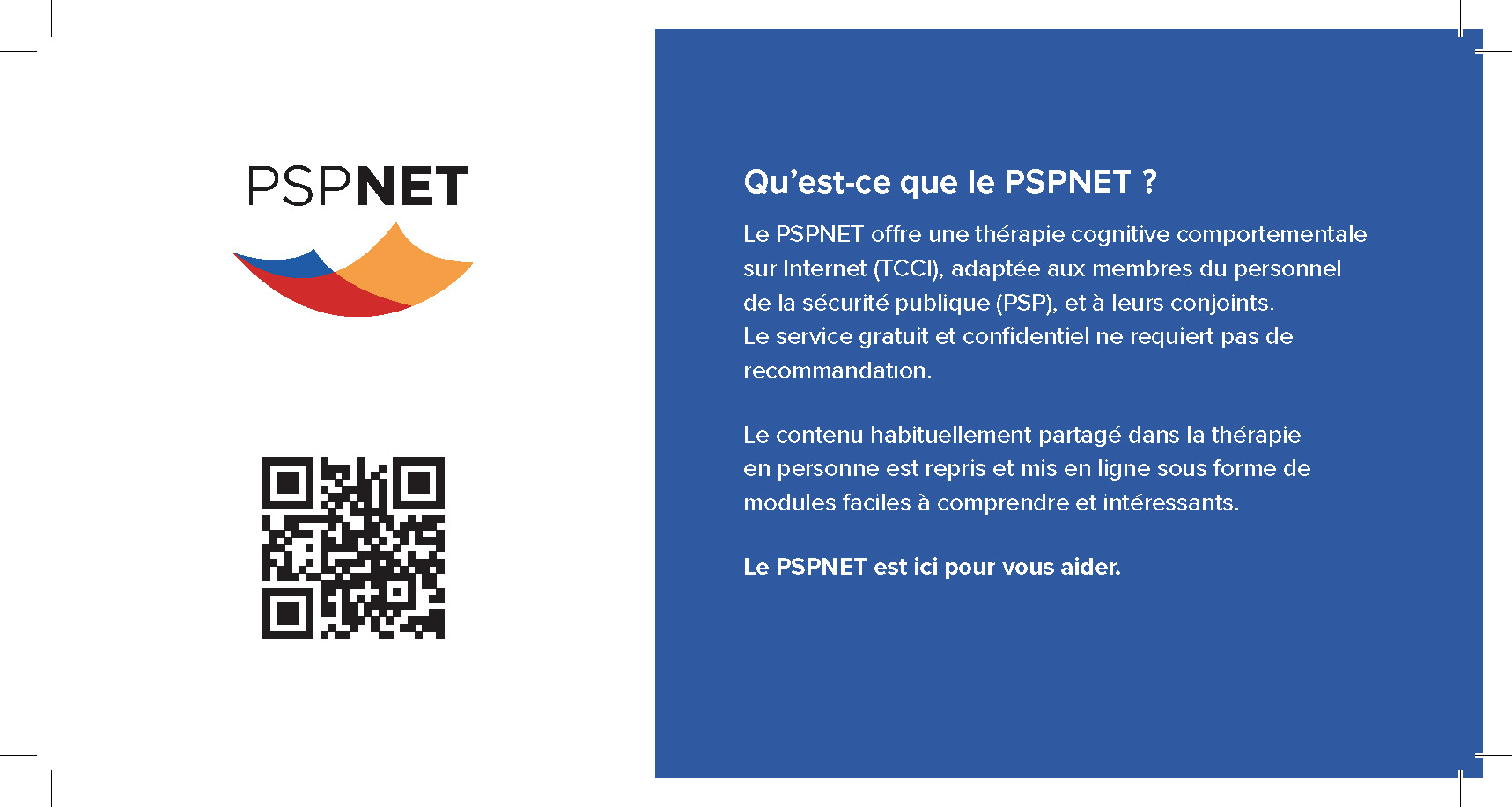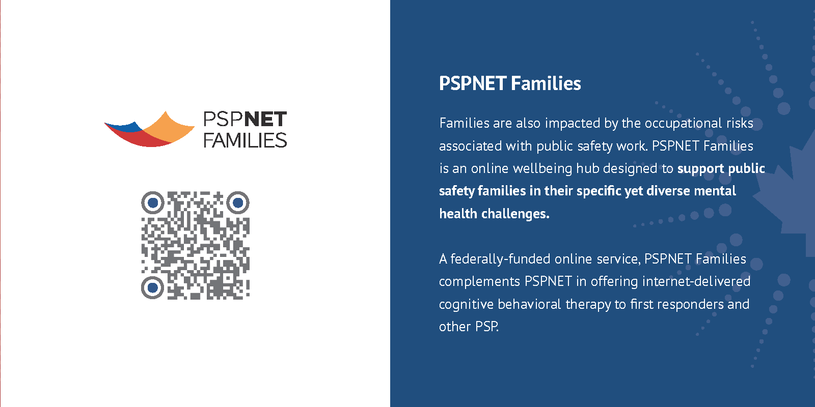 This postcard provides a concise introduction to PSPNET FAMILIES—an online wellbeing hub dedicated to supporting the mental health of Public Safety Personnel (PSP) families. Ideal for events, resource tables, or direct distribution, this postcard helps raise awareness and direct families to accessible mental health support through the QR code. PSPNET FAMILIES was developed by Drs. Heidi Cramm (Queen’s University), Heather Hadjistavropoulos (U of R), and Nathalie Reid (U of R) to support the spouses, children, and loved ones of first responders. Together, they are committed to ensuring families get the resources and care they need to ensure stronger public safety personnel and safer communities.
