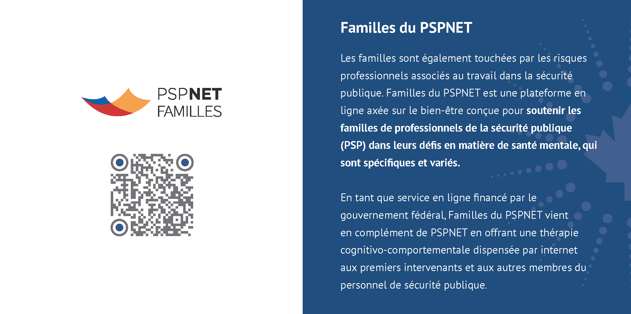 [French] Cette carte postale présente de manière concise le PSPNET Familles — un réseau de bien-être en ligne consacré au soutien de la santé mentale des familles des membres du personnel de la sécurité publique (PSP). Idéale pour des événements, des tables d’exposition ou pour une distribution directe, cette carte postale permet de sensibiliser et de diriger les familles vers du soutien en santé mentale à l’aide de codes QR. Le PSPNET Familles a été développé par les docteures Heidi Cramm (Université Queen’s), Heather Hadjistavropoulos (Université de Regina) et Nathalie Reid (Université de Regina) afin de soutenir les conjoints, les enfants et les proches des premiers intervenants. Elles s’engagent à assurer que les familles aient accès aux ressources et aux soins nécessaires pour un personnel de la sécurité publique plus fort, et des communautés plus sécuritaires.