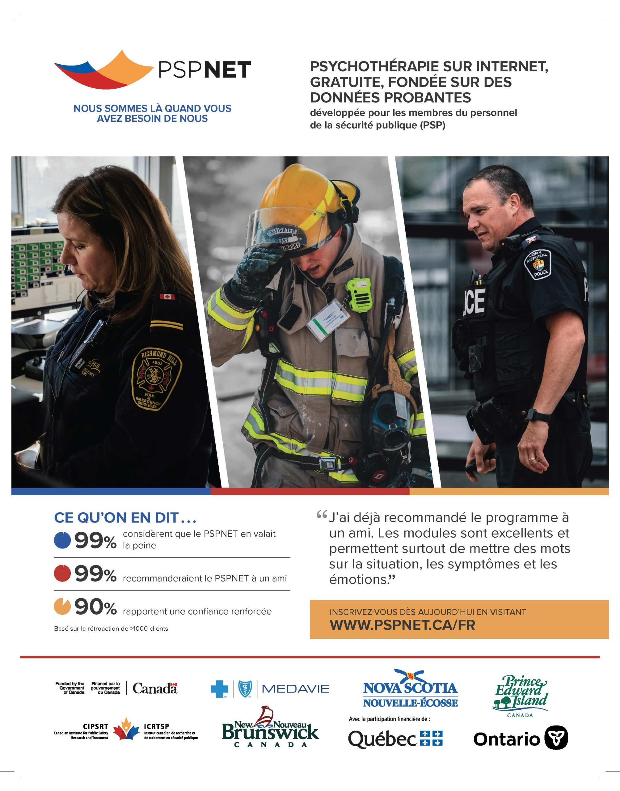 This one-page handout introduces PSPNET’s free, evidence-based, internet-delivered therapy designed specifically Public Safety Personnel (PSP). The resource includes powerful client feedback. PSPNET is helping PSP take meaningful steps toward mental wellness. It’s perfect for presentations, wellness kits, or outreach events.