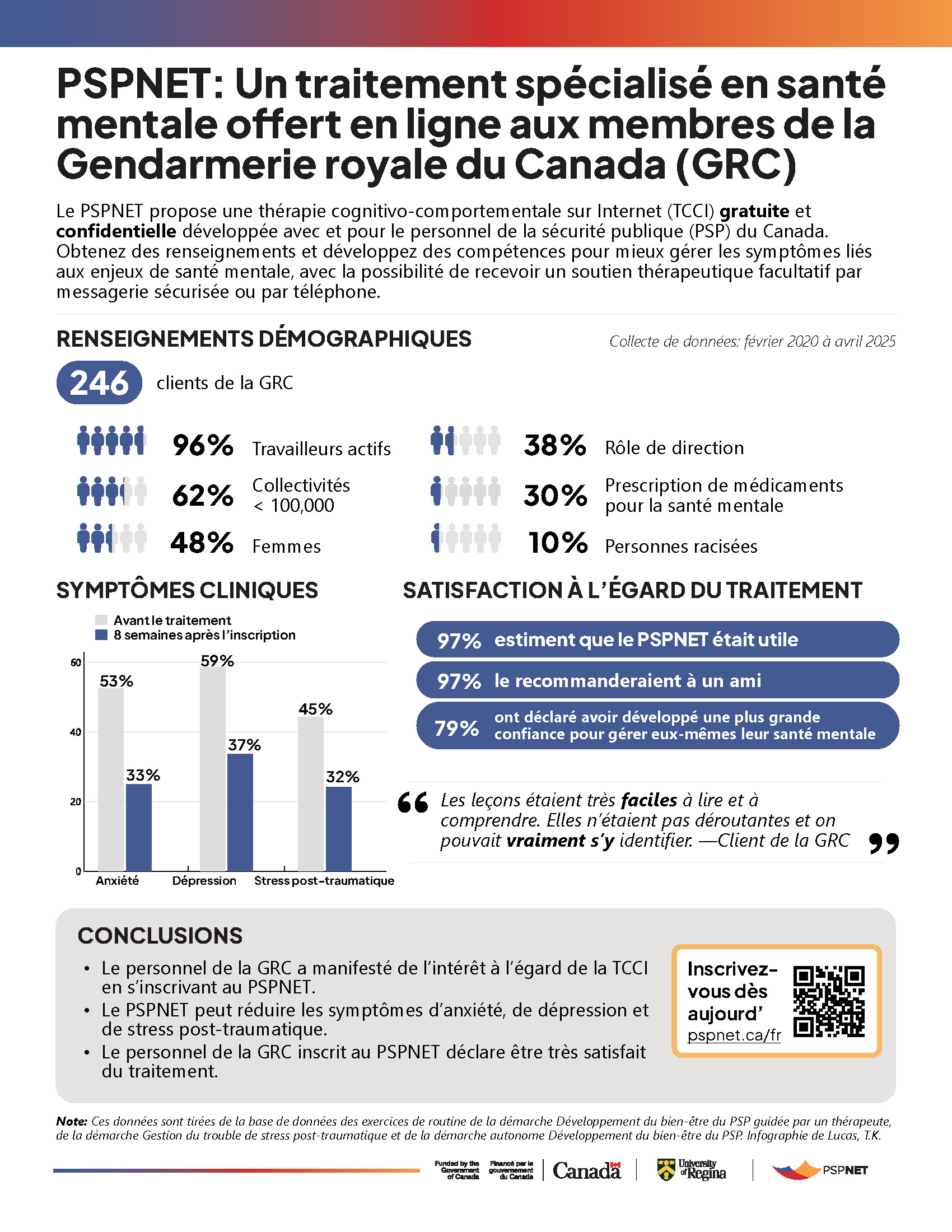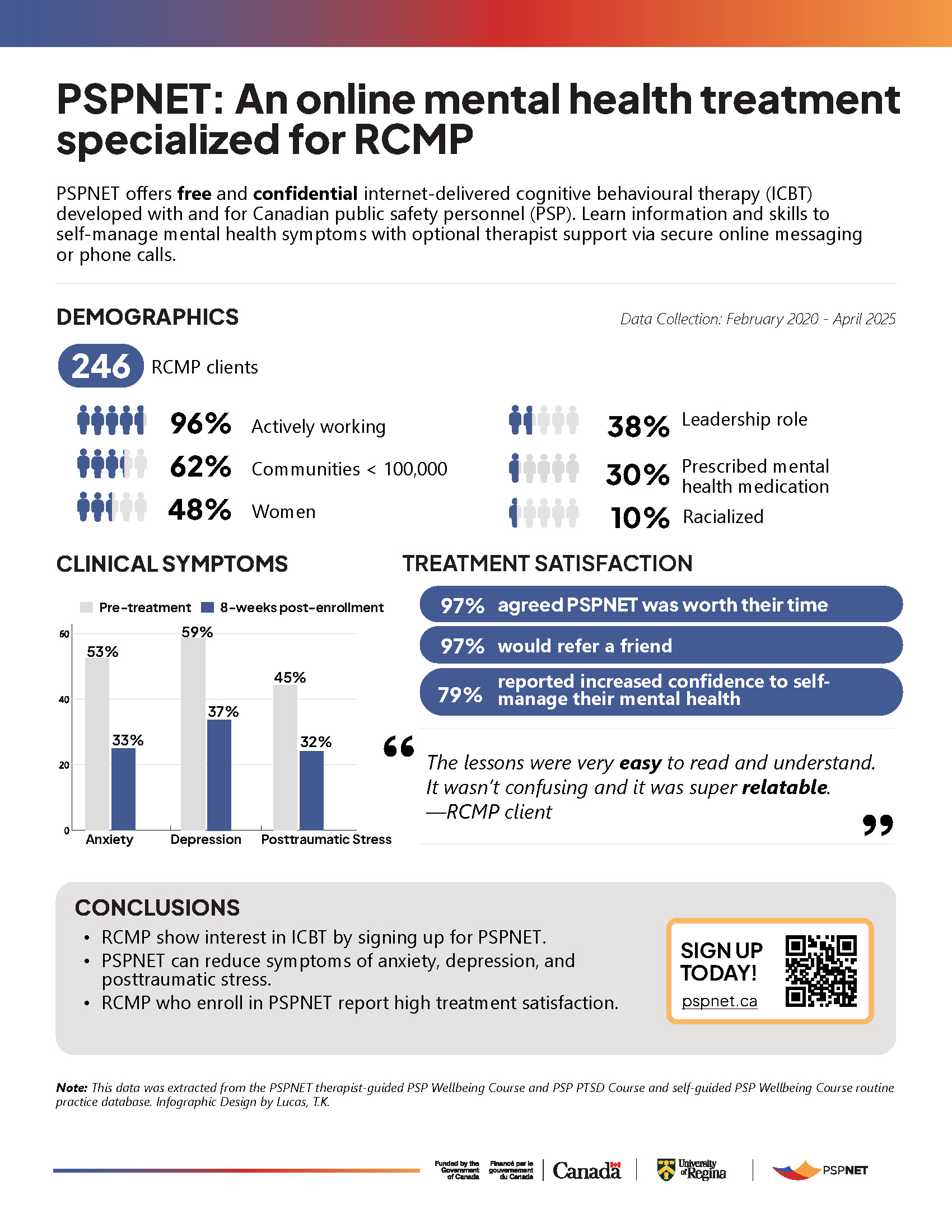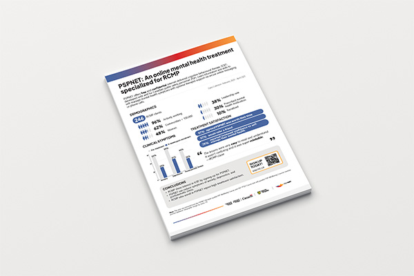 This infographic summarizes outcomes from PSPNET’s therapist-guided Wellbeing Course, focusing on Public Safety Personnel in Canada’s RCMP Sector. It presents demographic data, highlights symptom reductions in anxiety, depression, and PTSD, and reports exceptionally high satisfaction rates (97–100%). Featuring direct quotes from participants, the summary illustrates the positive impact of ICBT and is ideal for outreach, stakeholder engagement, and RCMP service organizations.