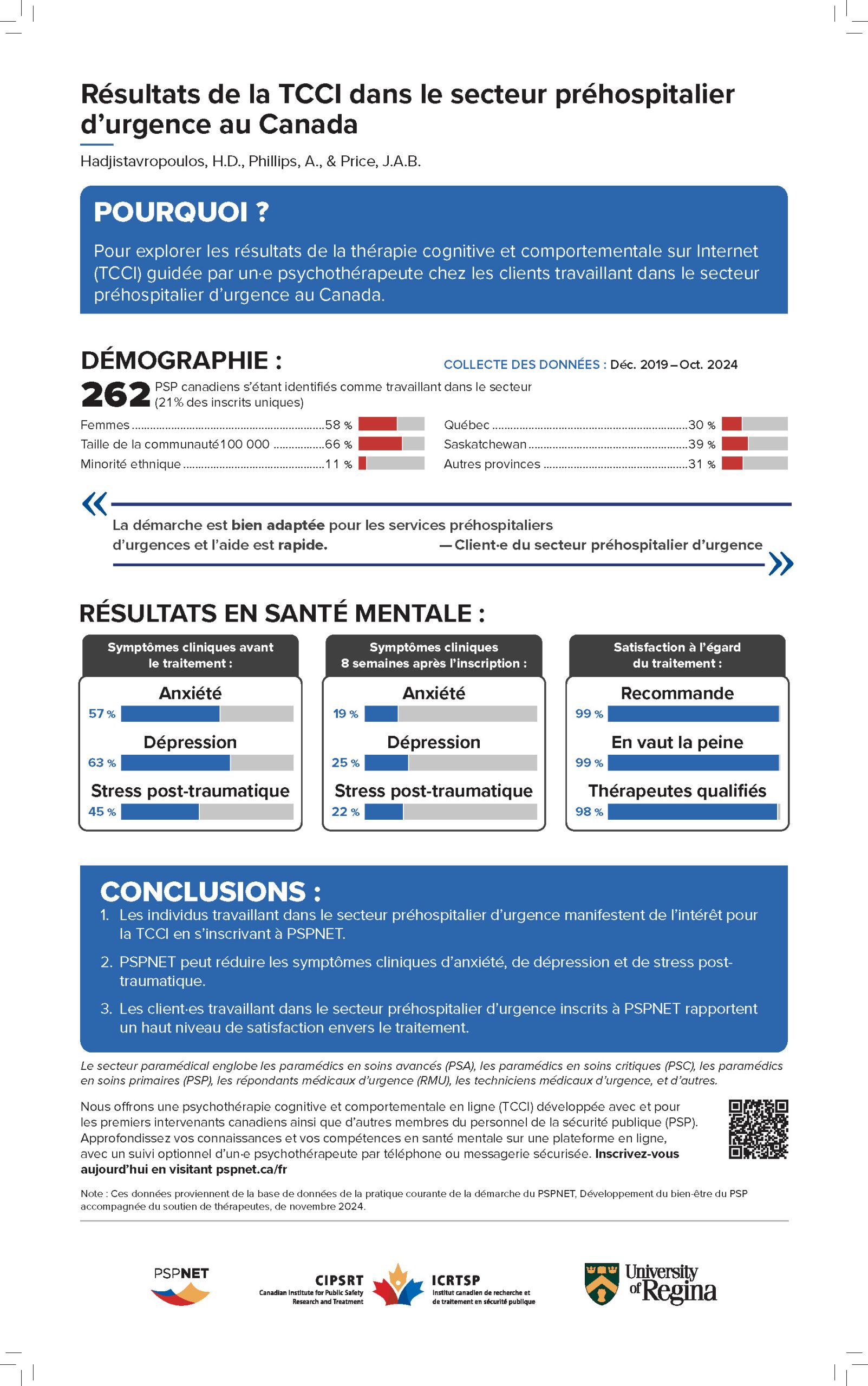 Cet infographie résume les résultats de la démarche « Développement du bien-être du PSP » avec l’accompagnement d’un-e psychothérapeute, en ce qui concerne les membres du personnel de la sécurité publique du secteur des incendies, au Canada. On y présente les données démographiques, souligne la diminution des symptômes d’anxiété, de dépression et de TPST, et rapporte des nivaux de satisfaction exceptionnellement élevés (97 % à 100 %). Grâce à des citations directes de participants, le sommaire illustre l’impact positif de lat TCCI et est idéal pour sensibiliser, engager les intervenants, et pour nformer les services d’incendie.