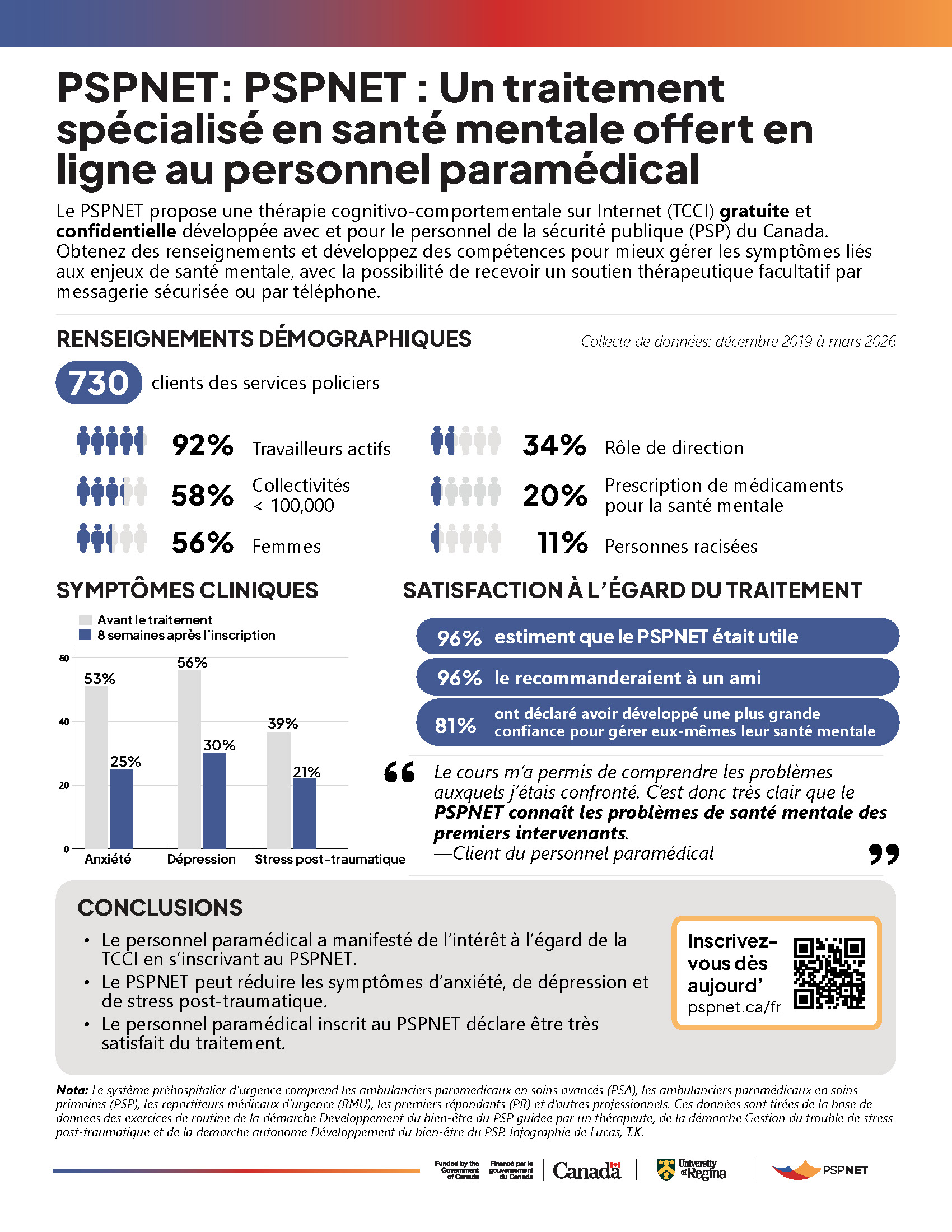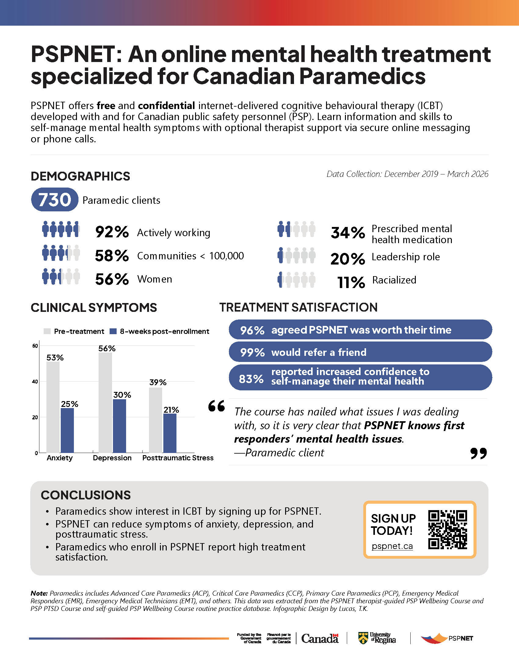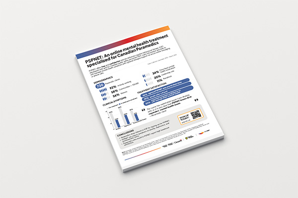 This infographic summarizes outcomes from PSPNET’s therapist-guided Wellbeing Course, focusing on Public Safety Personnel in Canada’s Paramedic Sector. It presents demographic data, highlights symptom reductions in anxiety, depression, and PTSD, and reports exceptionally high satisfaction rates (98–99%). Featuring direct quotes from participants, the summary illustrates the positive impact of ICBT and is ideal for outreach, stakeholder engagement, and paramedic service organizations.