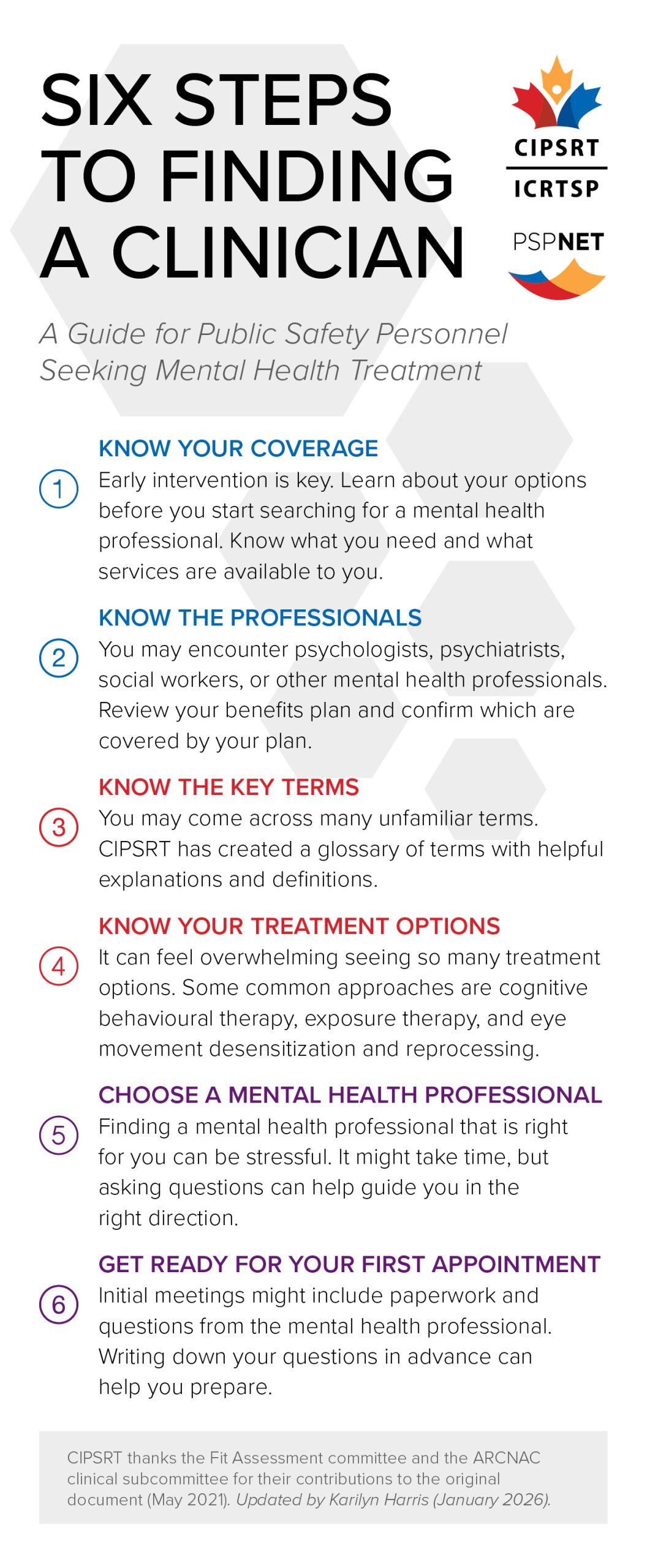 This introductory resource outlines six key considerations for Public Safety Personnel (PSP) and their families when beginning the search for a mental health clinician. It offers a high-level overview of important steps—from identifying personal needs to understanding the types of clinicians and treatment options available. While not a detailed guide, this one-page tool provides a helpful starting point for navigating the process and encourages individuals to take proactive steps toward mental wellness.