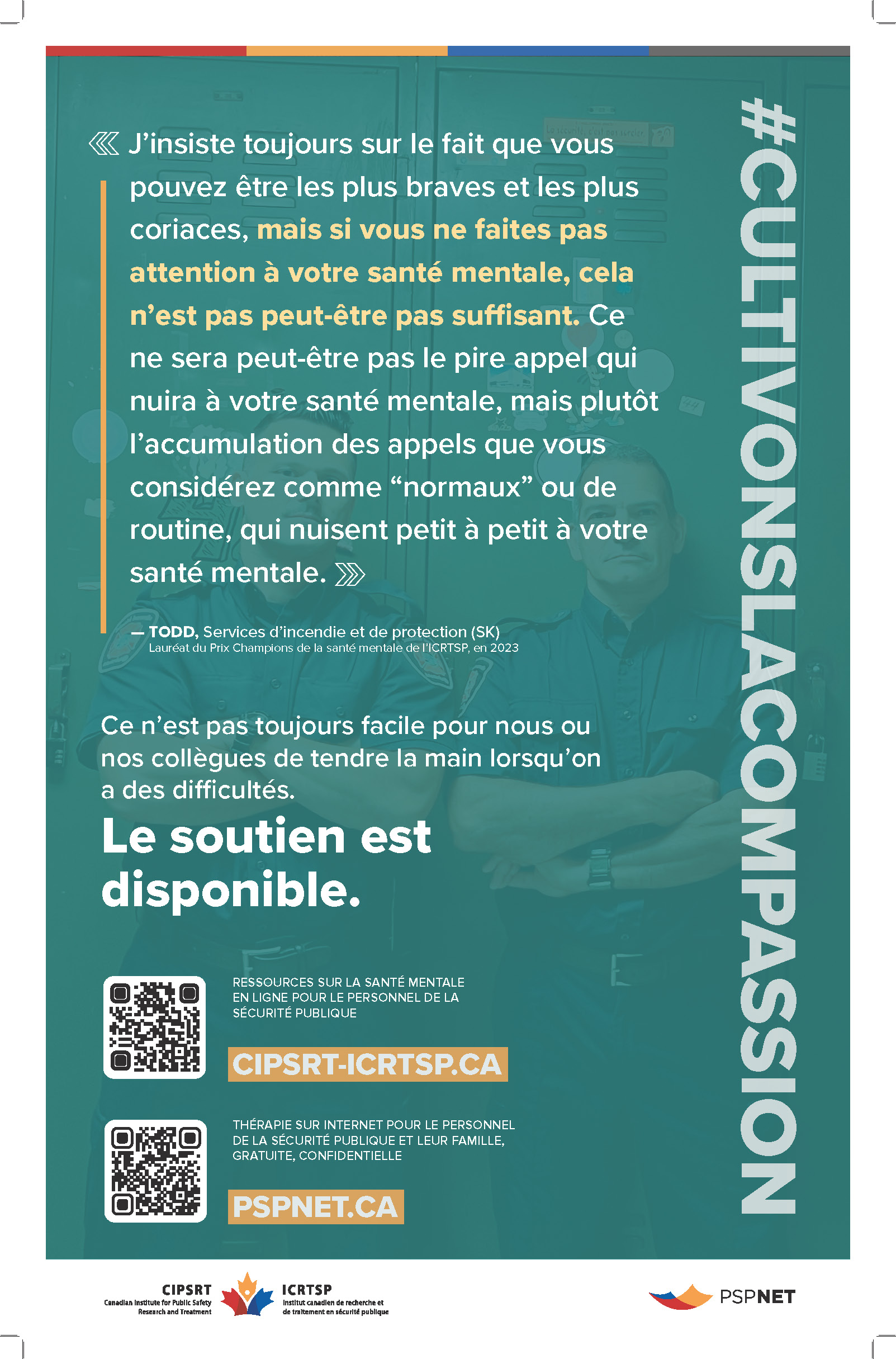Cette affiche partage un message très fort d’un membre des Services d’incendie et de protection et lauréat du prix Champions de la santé mentale présenté par l’ICRTSP. Elle explique comment l’exposition cumulative à des appels de routine, peut avoir un impact sur le bien-être, même chez les répondants les plus endurcis. Le message encourage également les membres du personnel de la sécurité publique (PSP) à faire de leur santé mentale une priorité et à demander du soutien tôt. En présentant la thérapie et les ressources fondées sur des données probantes, gratuites, offertes par le PSPNET et l’ICRTSP, l’affiche est idéale pour les casernes, les centres de formation, et les espaces de mieux-être.