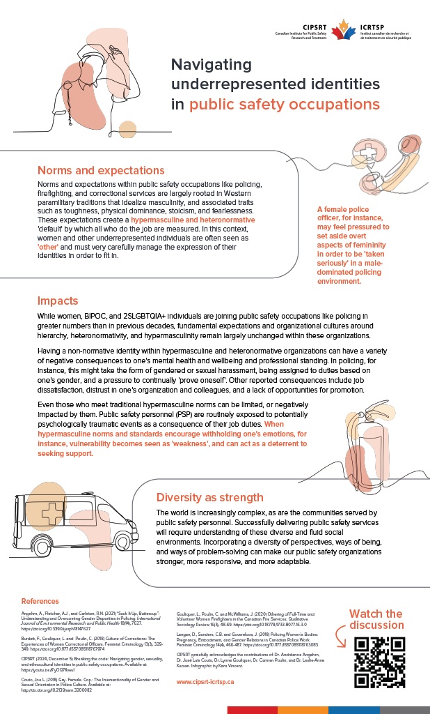 First responders and other public safety personnel (PSP) who are women, 2SLGBTQIA+, and/or ethnoculturally underrepresented do their jobs within established norms and expectations about what it means to be a police officer, a firefighter, a paramedic, a correctional officer. These norms are largely heteronormative and hypermasculine in orientation and create challenging occupational cultures for underrepresented PSP. Discriminatory practices around hiring and promotions, tokenism, sexual harassment, practices that disadvantage childbearing, and negative assumptions around ‘fitness for duty’ are just some of the ways PSP are impacted by occupational cultures that idealize hypermasculine ways of being as occupational standards.