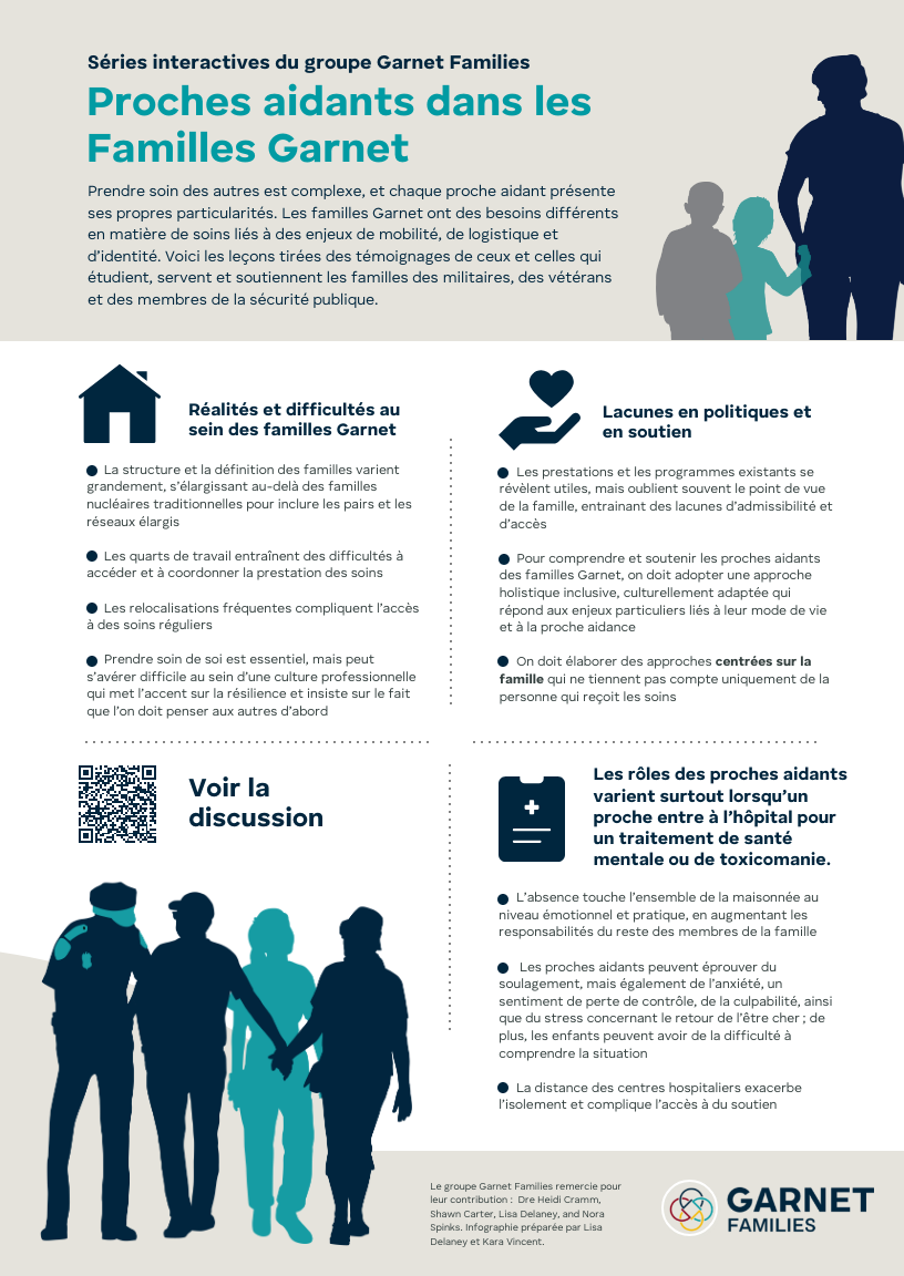 Docteure Heidi Cramm, Nora Spinks, et Shawn Carter vous invitent à participer à une table ronde multidisciplinaire qui examinera les différentes réalités des proches aidants des familles Garnet (familles des militaires, des vétérans, et du personnel de la sécurité publique).